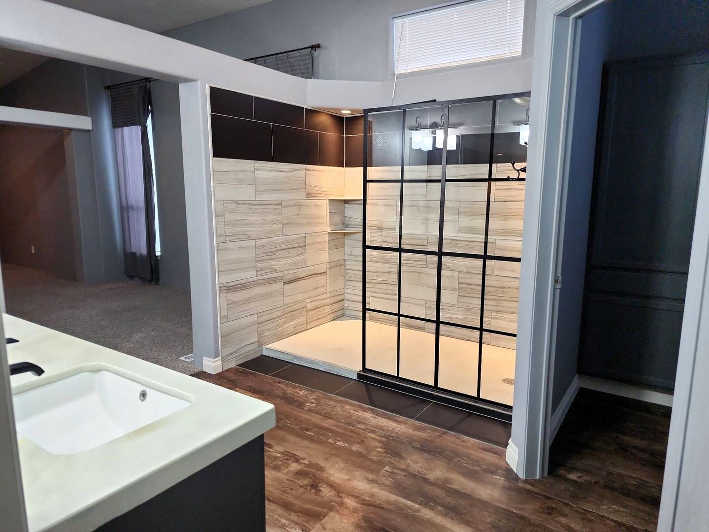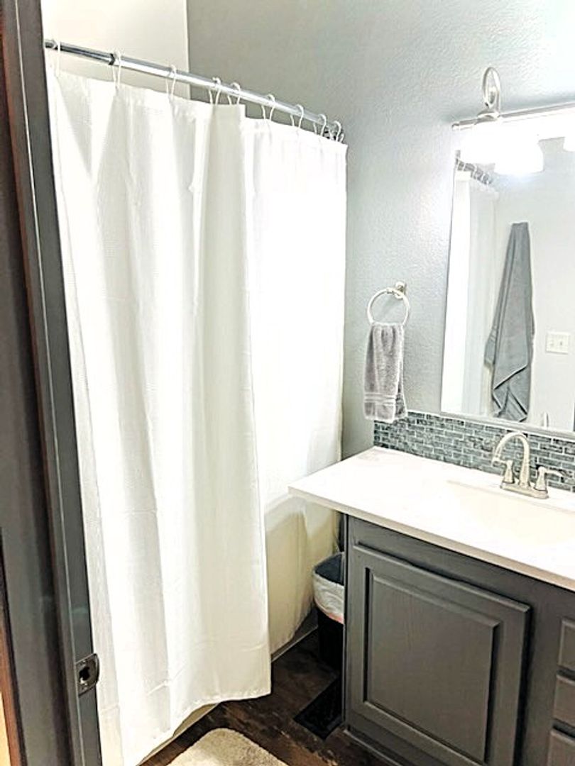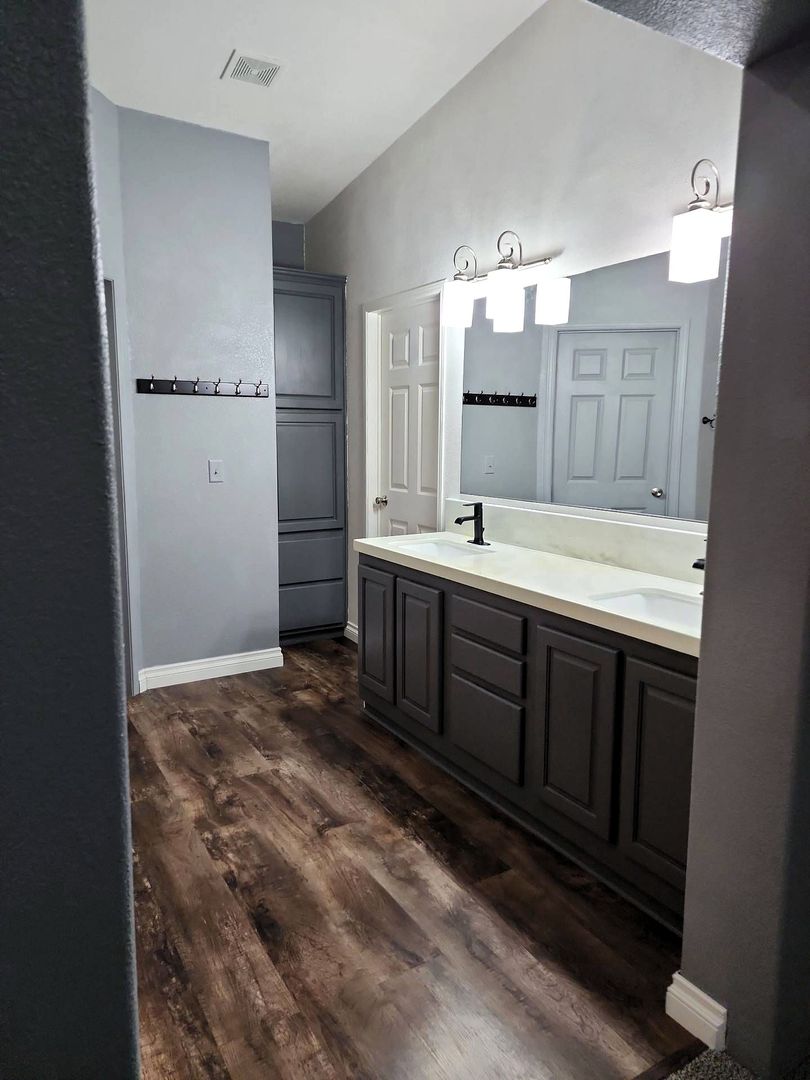 The spacious master suite offers a private retreat with a large walk-in shower and dual walk-in closets. Both additional bedrooms also include walk-in closets, providing plenty of storage throughout the home.